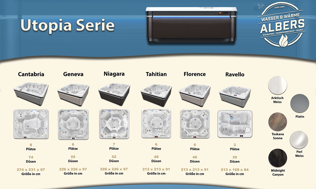 Wir arbeiten ausschließlich mit den Weltmarktführern der Watkins Gruppe zusammen, zu welchen auch Calderas Spas gehört. Sie stellen seit 1977 Whirlpools her und haben Händler in mehr als 70 Ländern weltweit. Ihre langjährige Erfahrung und Qualität setzen Maßstäbe in der Branche.