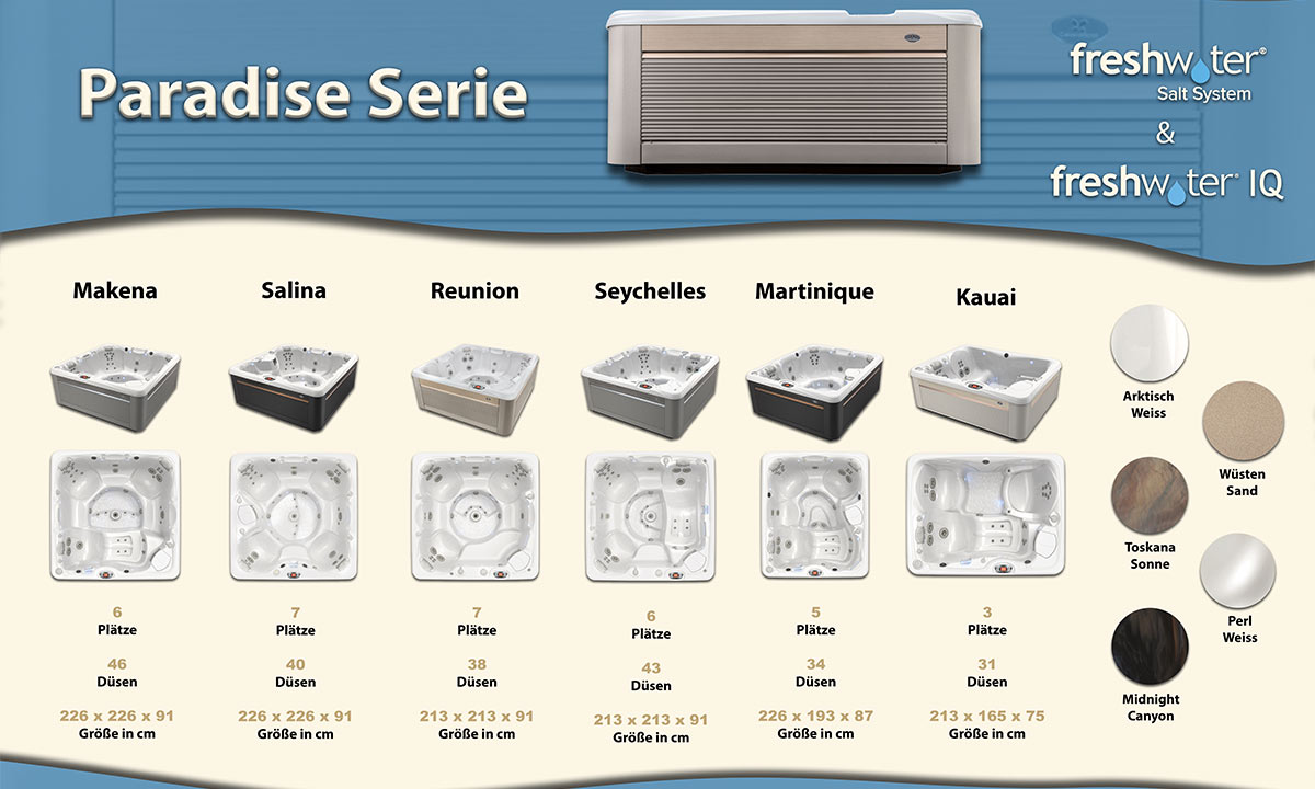Caldera Spas steht für erstklassige Whirlpools, die Komfort, Design und innovative Technologie vereinen. Die Modelle sind in drei exklusiven Serien erhältlich, die für verschiedene Bedürfnisse und Ansprüche entwickelt wurden. Lassen Sie sich von der großen Auswahl überzeugen!